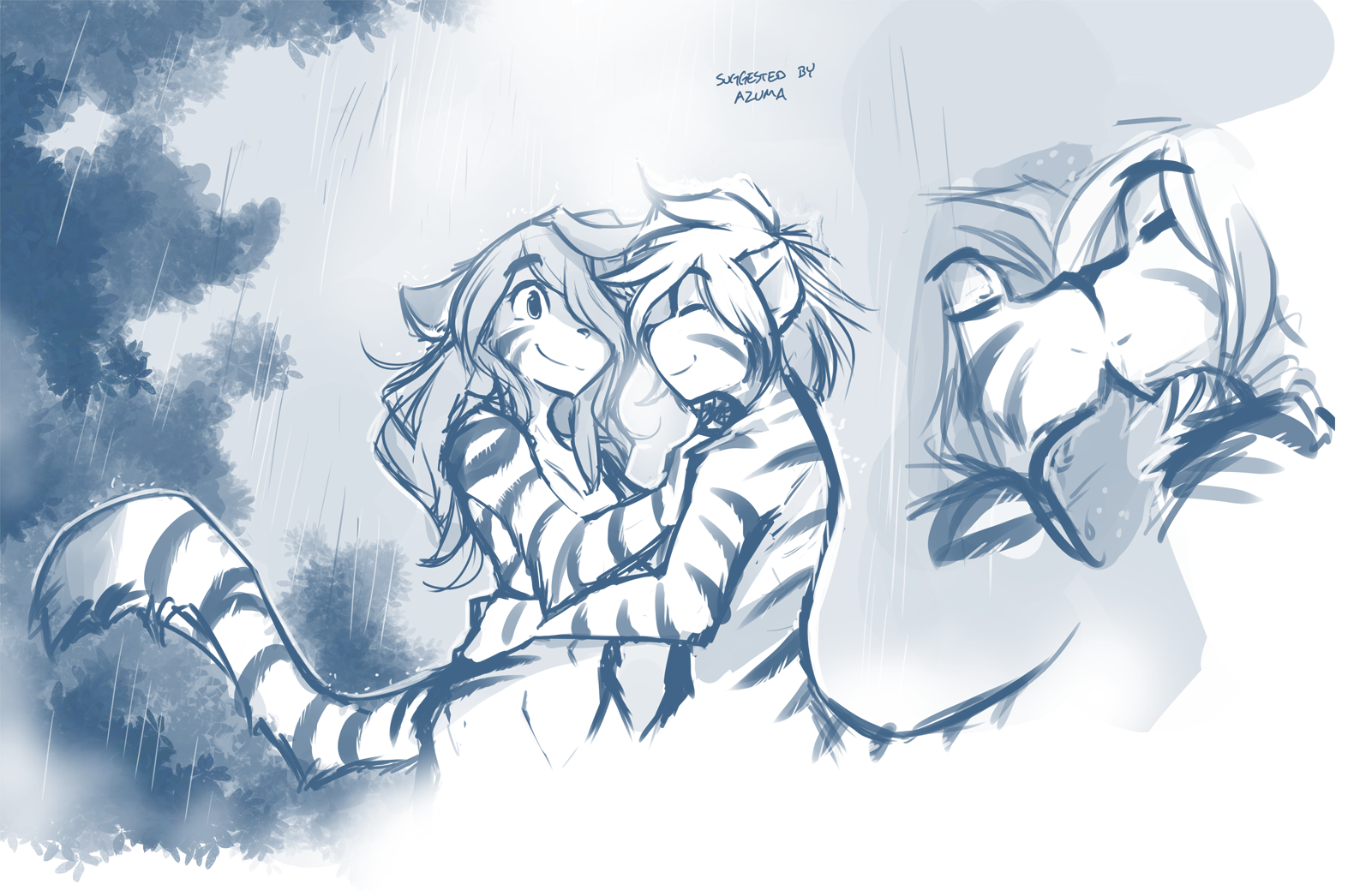 Flora and a tiger-y Trace enjoy the rain