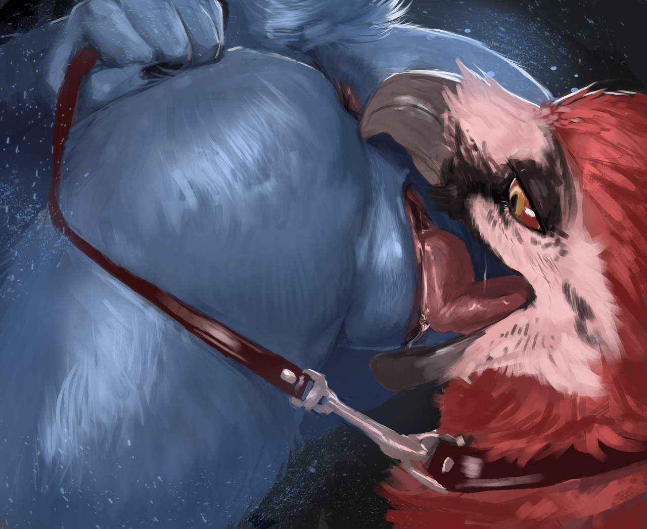 With all his eagerness to please, time was now against the collared bird dog. While a patient person in general, there were limits to that when you had such a delicious female holding onto the other side of the leash. The blue curvy frame was close enough to give off a scent, yet still far enough to just tickle the brain on what it might be. Each moment drawing in more details, the short vixen was right his type to just breed only making him ache all the more for action. Finally just as he was about to break that silence and speak up again, a gentle tug on the tether kept him in line. Thank god though as that delicious form would turn about, bending itself over offering up quite the view. That smell came again and only stronger as Gavin realized it was arousal from those puffy lips. Time wasn't on his side as that leash was slowly drawn in, pulling his head toward that spread backside. Tail raised up giving him access to the full offering of what he could enjoy. Right now was for her pleasure, mouth spreading as the tugging didn't stop. Pulling that dull edged beak above where the curved tip was almost teasing against that lovely pucker. The lower drew across those folds only to press past as the pressure didn't stop. Only when his tongue satisfyingly pressed to that heated flower did the motion pause. Pressure not let up as he couldn't draw free. The wordless instructions were far enough to go by, starting to tease across before another hard tug guided him to press that tendril inside. Far too busy now to speak, left to please and yet antagonize that offered flesh into becoming sensitive. Wanting to get that body worked up and primal needs demanding more from him.