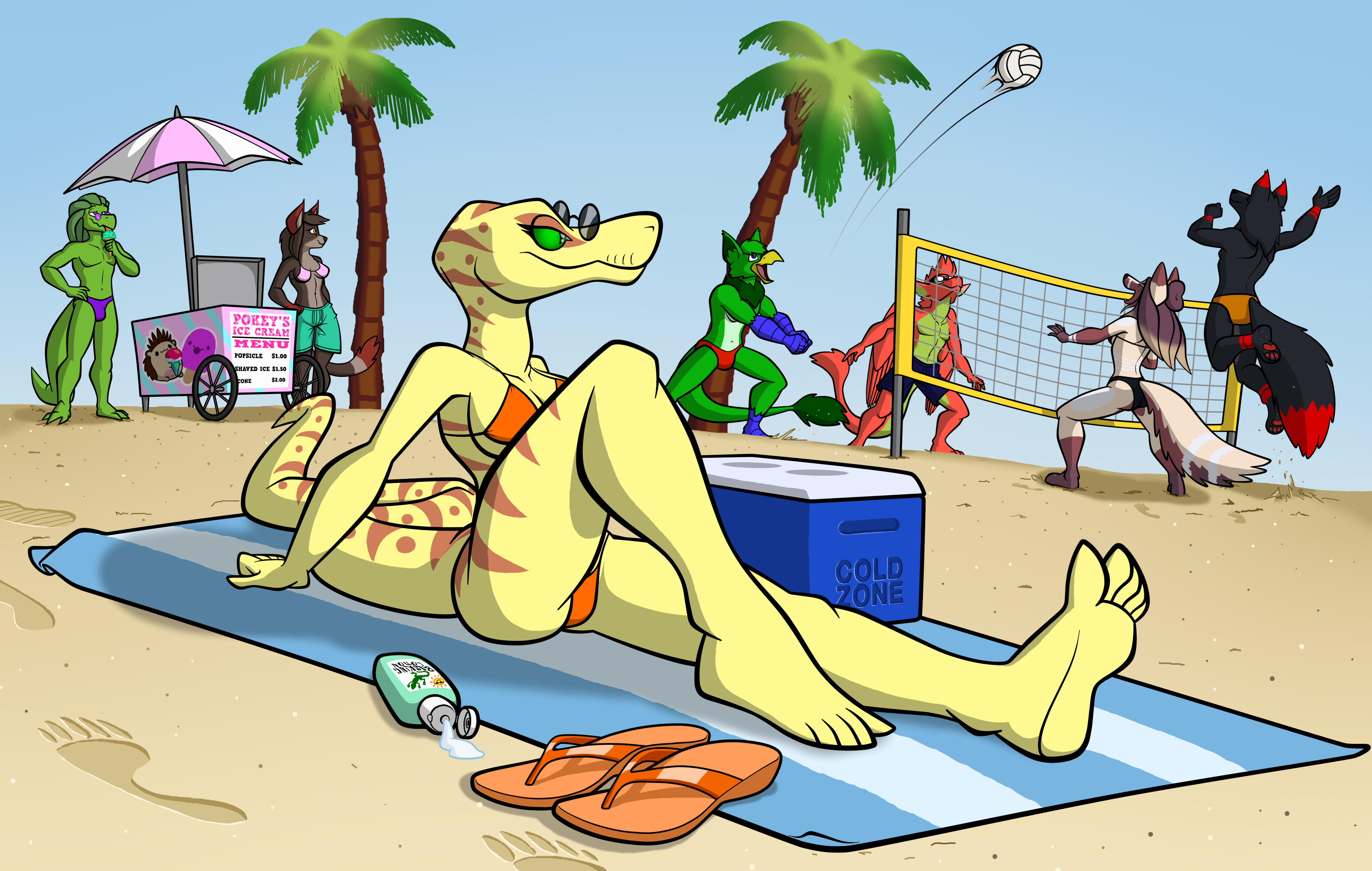 Elsie at the beach, enjoying some time in the sun, with some friends having fun in the background