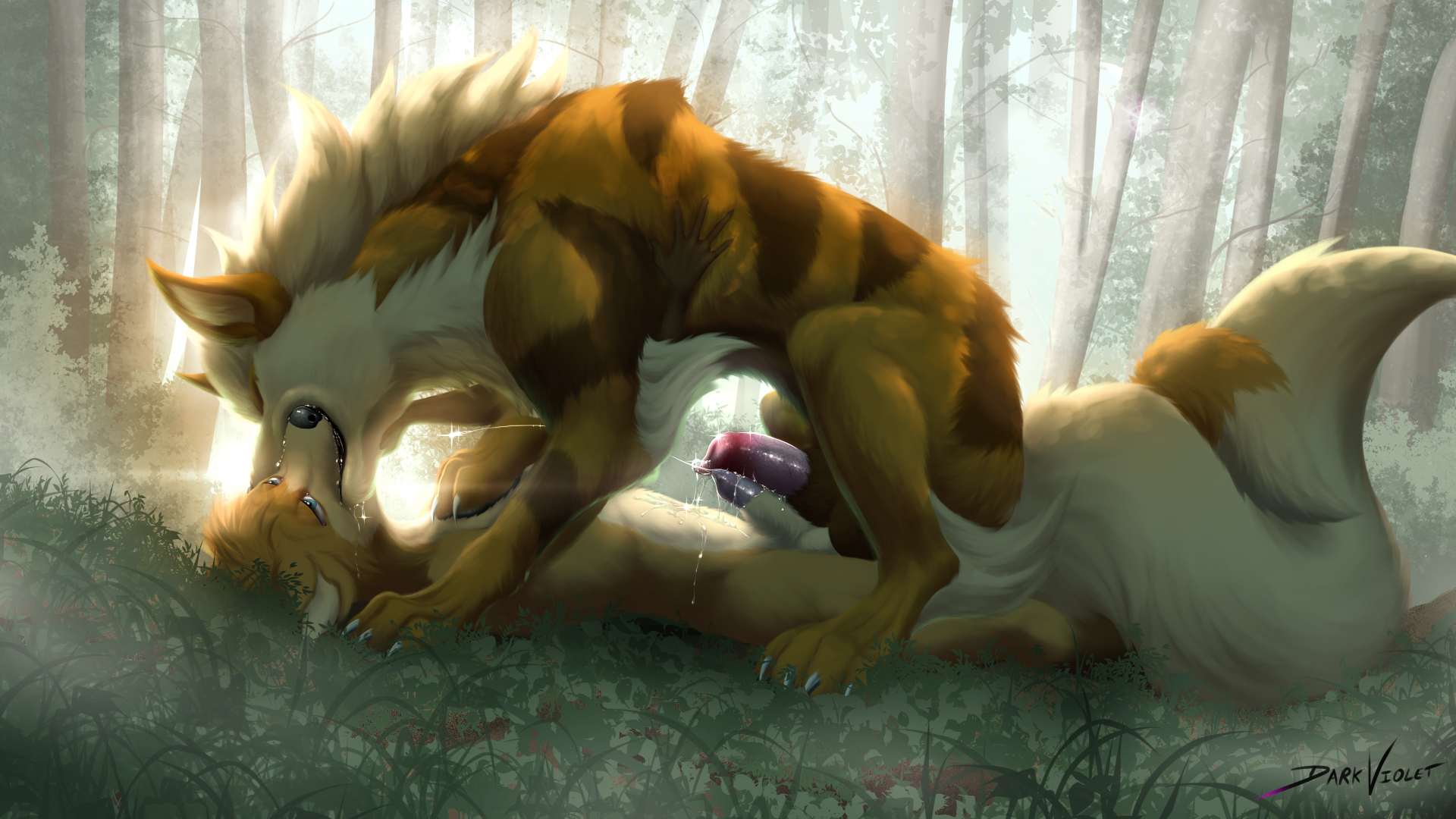 This was a fun one to do! <3 Sometimes, the simple prompts are the best - big Arcanine towering over a fox, front to front. Iterate through versions, get a nice kiss in there, some dripping shafts, play around with the lighting... and you have a lovely time drawing <3