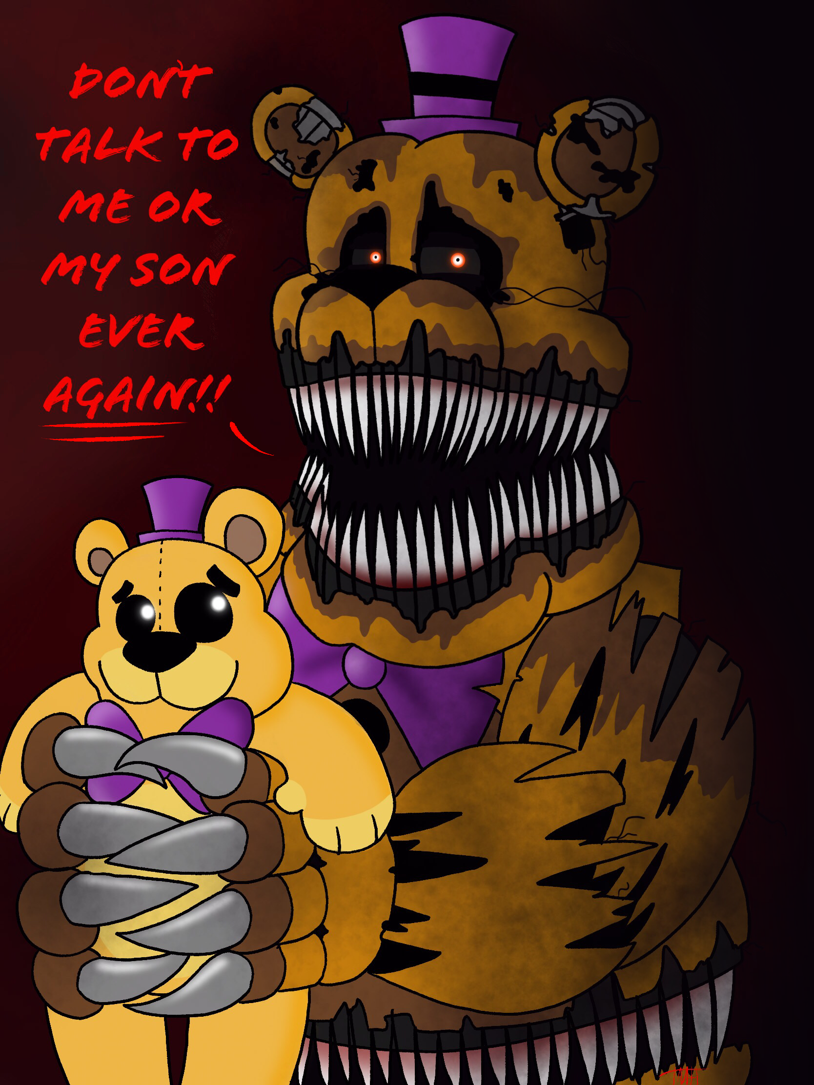 fredbear, nightmare fredbear, and plush fredbear (don't talk to me or my son ever again and etc) created by the masked hunter