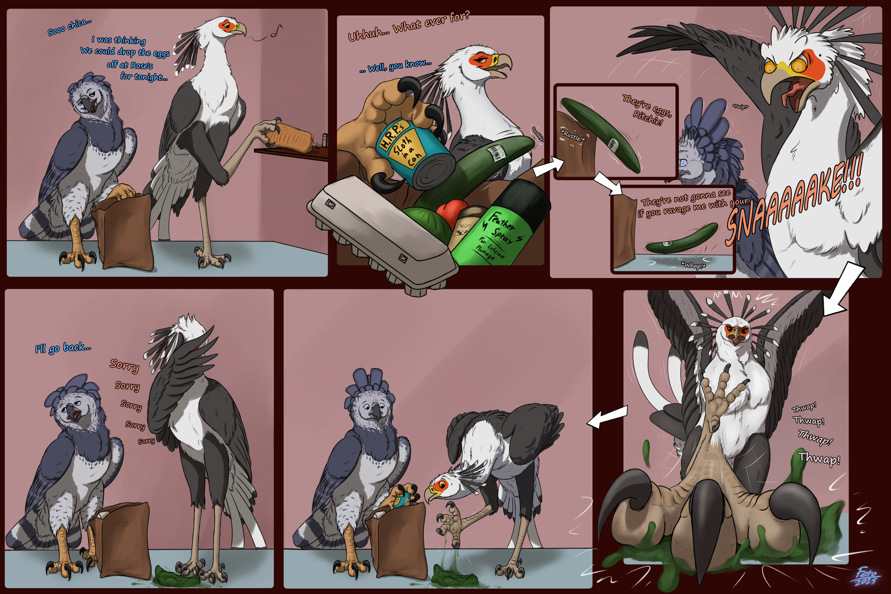 I suppose it ain't no secret am shipping these two cresty cretins together, so have some more of them being feral and silly. I've been writing a lot about their anthro versions in the book I'm working on, and occasionally I get a funny idea on how their at-home relationship would be as ferals, species specific quirks included. To the bird savvy among you, secretary birds are the stompy birds. They step on snek. One day and out of the blue I was reminded of those videos of cats reacting to a cucumber placed on the floor, and a little lightbulb lit up above my head. I called the electrician as it isn't supposed to do that, but afterwards I thought about how a secretary bird might react to such a vegetable. Thus came to be this little silly slice of feral married life.