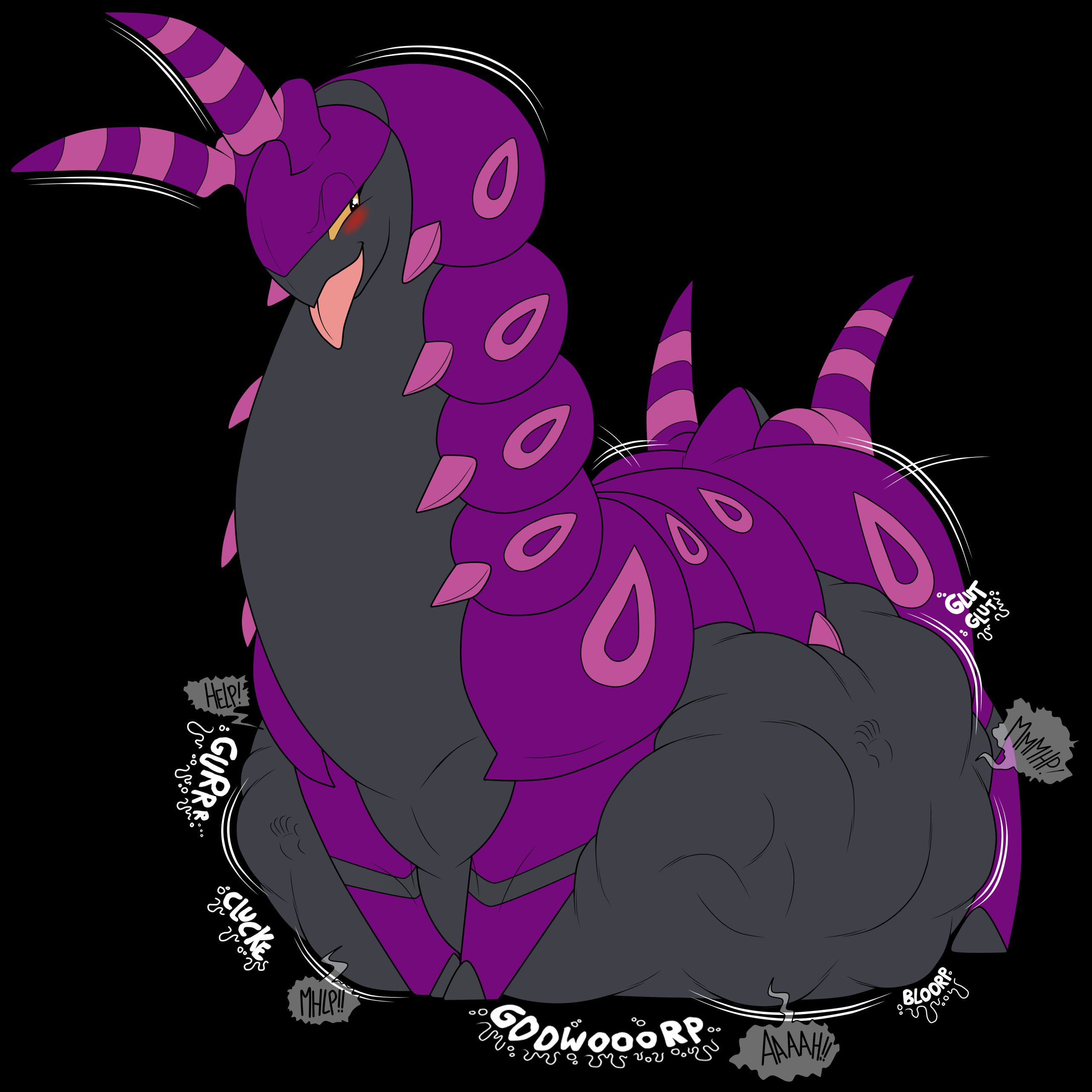 After eating Misty, May, Dawn, Iris, and Serena, Pandora enjoys the struggles of her prey inside her belly.